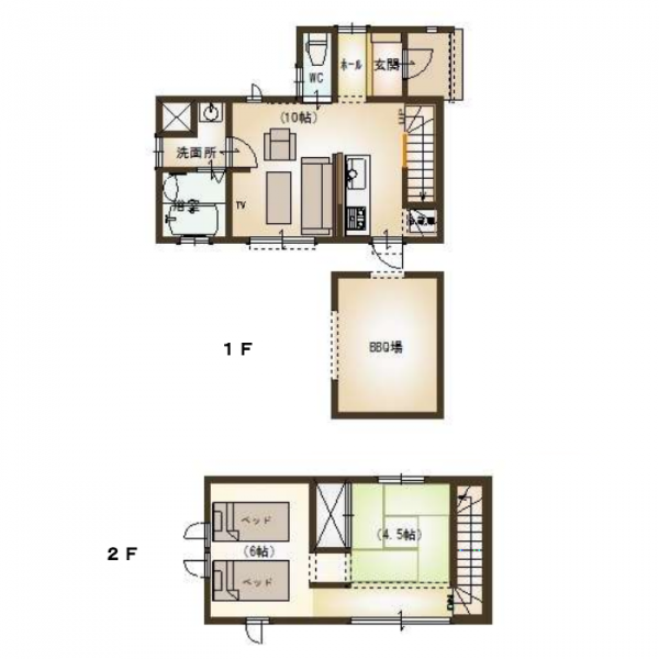 | 間取り | ベッドルーム:シングルベッド2台 和室:布団3式 リビングルーム キッチン BBQ専用テラス バスルーム(シャワー&バスタブ付) 洗面台:1 化粧室:1 |